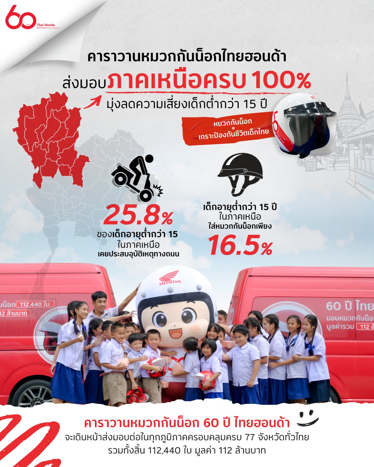 ไทยฮอนด้า เดินหน้าเกินครึ่งทาง คาราวานหมวกกันน็อก 60 ปี ส่งมอบความปลอดภัยสู่เด็กไทย 62,310 ใบ จากเป้าหมาย 112,440 ใบ ทั่วประเทศ