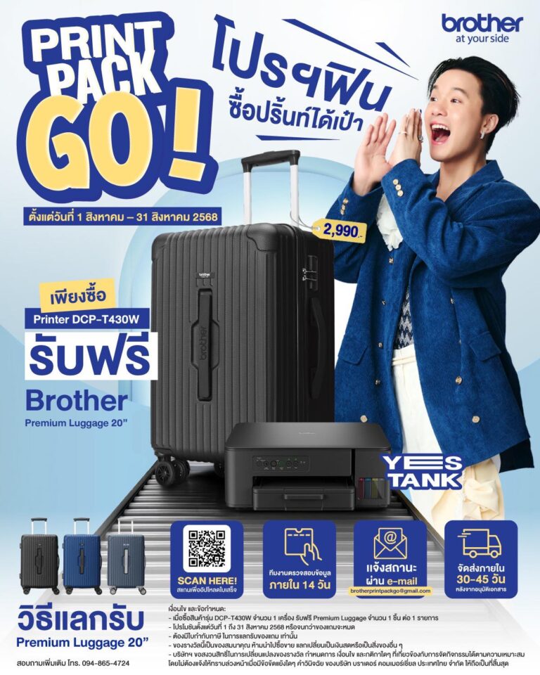 Brother ผู้นำโซลูชันด้านการพิมพ์จากประเทศญี่ปุ่น ชวนยกระดับความคุ้มแบบแพ็กคู่รับเดือนสิงหาคมด้วยโปรโมชั่น “Print Pack Go! โปรฯ ฟินซื้อปริ้นท์ได้เป๋า” เพียงซื้อ Brother YES Tank รุ่น DCP-T430W และลงทะเบียนที่เว็บไซต์ รับฟรีกระเป๋าเดินทางพรีเมี่ยมขนาด 20 นิ้ว จำนวน 1 ใบ มูลค่า 2,990 บาท (เงื่อนไขเป็นไปตามที่บริษัทกำหนด) โดยปริ้นเตอร์อิงค์แท็งค์รุ่นนี้มีขนาดกะทัดรัดมาพร้อมฟังก์ชันครบครัน รองรับทั้งงานพิมพ์ ถ่ายเอกสาร สแกน และแฟกซ์ ให้คุณภาพคมชัดสีสวยสมจริง ดีไซน์ทันสมัย พิมพ์หมึกดำได้สูงสุดถึง 7,500 แผ่น และหมึกสี 5,000 มีระบบ AI Auto Cleaning ล้างหัวพิมพ์อัตโนมัติ หมดปัญหาเรื่องหัวพิมพ์อุดตัน…