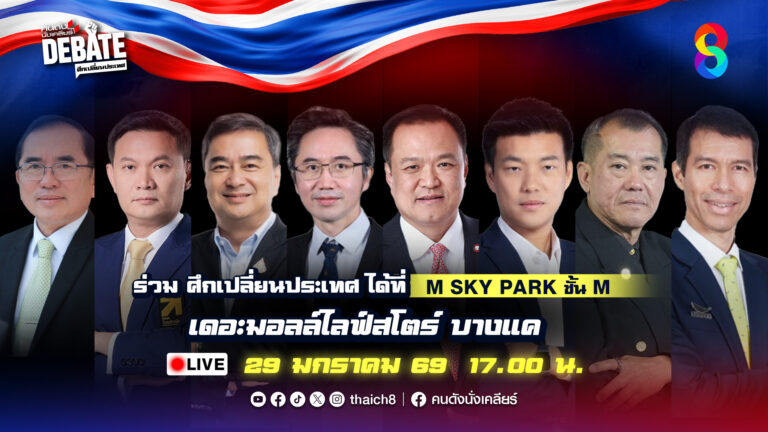 สถานีโทรทัศน์ช่อง 8 หลังเดินหน้าสร้างปรากฏการณ์ข่าวการเมืองครั้งยิ่งใหญ่ เปิดตัวแคมเปญ ลุยเลือกตั้ง 69 : ศึกเปลี่ยนประเทศ เกาะติดทุกสมรภูมิเดือดแบบ Realtime พร้อมประกาศจัดเวทีประชันวิสัยทัศน์ “คนดังนั่งเคลียร์ Debate : ศึกเปลี่ยนประเทศ” ดึงตัวแทนพรรคการเมืองชั้นนำ ปะทะ เหล่าคนดังตัวตึงระดับประเทศ เพื่อเคลียร์ชัดทุกนโยบาย เพื่อถามแทนใจประชาชนทั่วประเทศ ในวันพฤหัสบดีที่ 29 มกราคมนี้ เวลา 17.00 น. ณ เดอะมอลล์ ไลฟ์สโตร์ บางแค โดยไฮไลต์สำคัญบนเวทีดีเบตที่ดุเดือดที่สุด “คนดังนั่งเคลียร์ Debate : ศึกเปลี่ยนประเทศ” ทำขึ้นเพื่อกะเทาะเปลือกนโยบายและถามคำถามที่ประชาชนอยากรู้มากที่สุดแบบไม่มีอ้อมค้อม สำหรับการเปิดเวทีดีเบตครั้งสำคัญนี้ ได้รับเกียรติจากตัวแทนพรรคการเมืองและแขกรับเชิญพิเศษเข้าร่วมปะทะทางความคิด ที่แฟนๆรายการห้ามพลาดรับชม รายชื่อนักการเมืองและพรรคการเมือง…