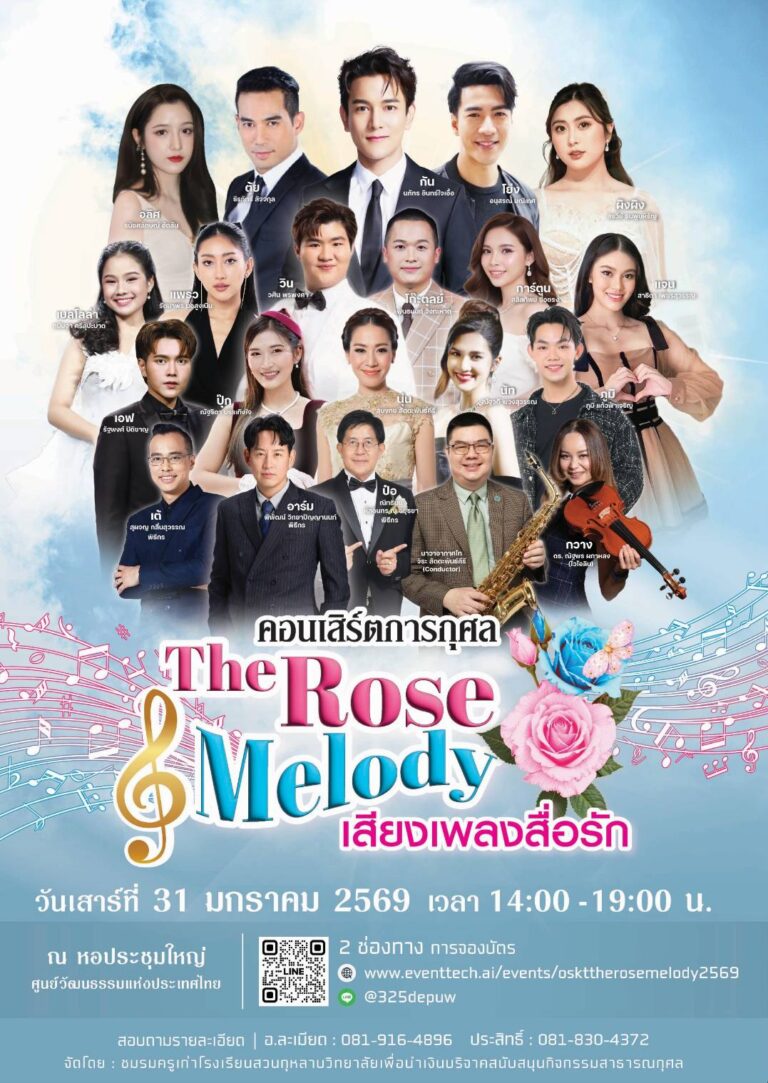 31 มกราคมนี้ ที่หอประชุมใหญ่ ศูนย์วัฒนธรรม มาร่วมสัมผัสเสียงเพลงแห่งความสุข ความสนุกแบบเต็มอิ่ม กว่า 50 บทเพลงยอดนิยม ผลงานจากปลายปากกาของบรมครูนักแต่งเพลงที่ทรงคุณค่า เพลงระดับตำนานที่ยังคงตราตรึงใจ ที่ส่งต่อจากรุ่นสู่รุ่น ที่ไม่เคยจางหาย ใน“The Rose Melody เสียงเพลงสื่อรัก” คอนเสิร์ตการกุศลที่จัดโดยชมรมครูเก่าสวนกุหลาบวิทยาลัย เพื่อสนับสนุนกิจกรรมสาธารณกุศล พบกับการรวมตัวของศิลปินชื่อดังของเมืองไทย พร้อมด้วยศิลปินที่คว้ารางวัลจากเวทีการประกวดร้องเพลงระดับประเทศ อาทิ ตุ้ย-ธีรภัทร์ สัจจกุล, กัน-นภัทร อินทร์ใจเอื้อ, โย่ง-อนุสรณ์ มณีเทศ, ผิงผิง-สรวีย์ ธนพูนหิรัญ, เบลโลล่า-กนิษฐา ศรีลุปะบาต, อลิศ-ธนัชศลักษณ์ ฮัดสัน,แพรว-รัตนาพร นอสูงเนิน, ปุ๊ก-ณัฐริดา บรรเทิงใจ, แจน-สาธิตา เพชรสุวรรณ, นัท-ณัฐวดี…