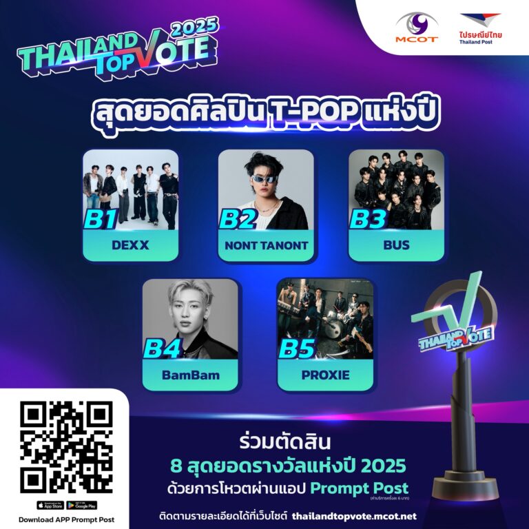 เอ็นดูใครสุดหัวใจ ไม่อยากให้พลาด ร่วมโหวตแบบมีสไตล์ กับรางวัล “Thailand Top Vote 2025” สไตล์แรก “เปิดให้โหวตฟรี 1 ครั้งต่อวัน” และไม่ใช่ใครก็ได้ที่จะได้ทอง แต่ใครทุกคนมีสิทธ์ได้ถ้าร่วมโหวต กับสไตล์ที่สอง “ทุกสัปดาห์ผู้ร่วมโหวตที่มียอดสูงสุด 2 อันดับแรกในทุกสาขารับทองทันที โดยจะมีการแจกทองคำรวมมูลค่า 2 ล้านบาท” ปิดท้ายเตรียมรับรางวัลเพียบจาก “เลขรับโชค” ในโปสการ์ดที่ร่วมโหวต ทุกสไตล์พร้อมให้ร่วมโหวตได้ ทางแอปพลิเคชัน Prompt Post รางวัล “Thailand Top Vote 2025” VOICES OF WORTH เสียงแห่งคุณค่า รางวัลที่สร้างความภาคภูมิใจ สร้างแรงบันดาลใจ พร้อมกำลังใจ…