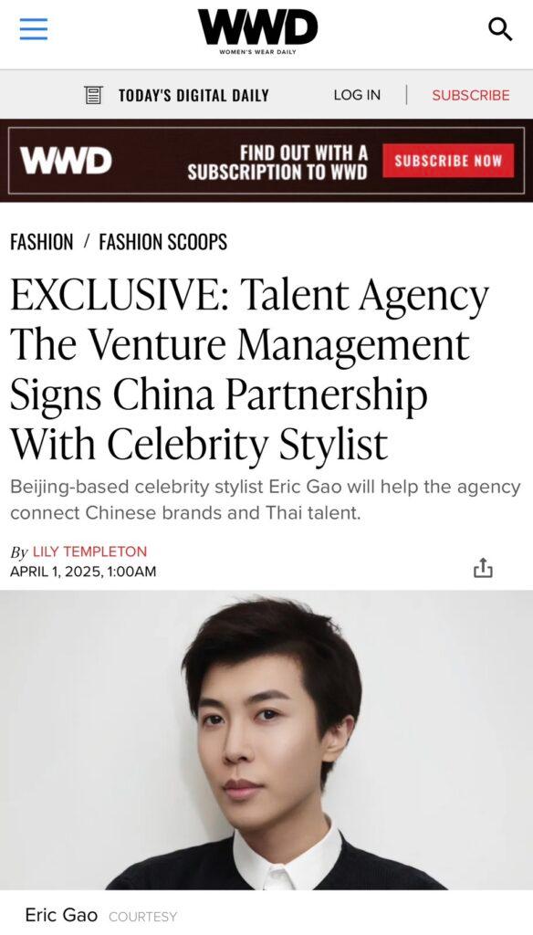 โดยโปรไฟล์พันธมิตร “Eric Gao” สไตลิสต์ชื่อดัง และผู้เจรจาดีลแฟชั่นระดับแนวหน้าของจีน เคยทำงานร่วมกับดาราชื่อดังของจีนอย่าง กวน เสี่ยวถง (Guan Xiaotong) และ ลู่หาน (Lu Han) จาก EXO มองเห็นศักยภาพของศิลปินจากประเทศไทย ด้วยกระแสความนิยมของ เซเลบริตี้ไทยที่กำลังพุ่งสูงขึ้นในประเทศจีน การผนึกกำลังร่วมงานกับ The Venture Management เหมือนเป็นการสร้างสะพานเชื่อมโยงระหว่าง ดาราไทยระดับแถวหน้าและแบรนด์สินค้าจีน โดยนำเสนอโอกาสในการร่วมงานกับ ศิลปินที่มีอัตราการมีส่วนร่วมสูง (high engagement) ในราคาที่แข่งขันได้ เมื่อเทียบกับศิลปินจากวงการ K-pop ซึ่งสอดคล้องกับพันธกิจของบริษัทในการ ผลักดันศิลปินเอเชียสู่เวทีโลก