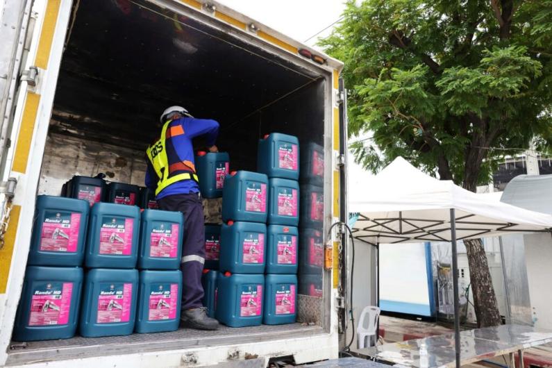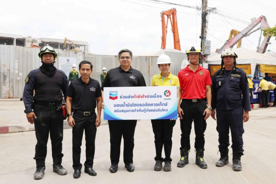 เมื่อเร็ว ๆ นี้ บริษัท เชฟรอน (ไทย) จำกัด ผู้ผลิตและจัดจำหน่ายผลิตภัณฑ์น้ำมันหล่อลื่นคาลเท็กซ์ ฮาโวลีน และคาลเท็กซ์ เดโล่ นำโดย นายสันติศักดิ์ ไทยพัฒน์ ประธานกรรมการและผู้จัดการใหญ่ บริษัท เชฟรอน (ไทย) จํากัด (ที่ 3 จากซ้าย) มอบน้ำมันไฮดรอลิค คาลเท็กซ์ แรนโด้จำนวนรวม 1,620 ลิตร ให้แก่ นางสาวภัทร์กร สินสุข ผู้อำนวยการเขตจตุจักร กรุงเทพมหานคร (ที่ 3 จากขวา) เพื่อสนับสนุนการปฏิบัติภารกิจของเจ้าหน้าที่กู้ภัยในการใช้งานกับเครื่องจักรในการกู้ภัย อาทิ รถขุด รถเครน รถตัก และเครื่องมืออื่น ๆ สำหรับปฏิบัติการค้นหาผู้สูญหายที่คาดว่ายังติดอยู่ใต้ซากอาคารสำนักงานตรวจเงินแผ่นดิน (สตง.) ที่ถล่มลงมาหลังเหตุการณ์แผ่นดินไหว ให้เป็นไปได้อย่างราบรื่นและมีประสิทธิภาพมากยิ่งขึ้น ณ ศูนย์บัญชาการเหตุการณ์ จตุจักร กรุงเทพฯ