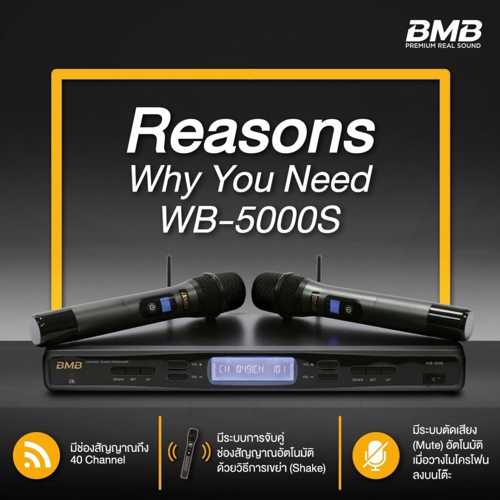 · BMB WB-5000S ไมโครโฟนคู่ไร้สายแบบมือถือ ระบบ UHF ความถี่ 748–758 MHz รองรับการใช้งานได้ไกลถึง 50 เมตร (ในพื้นที่โล่ง) ให้เสียงคมชัด ไร้สัญญาณสะดุด ตัวไมค์เป็นแบบยูนิไดเร็คชันนอล จับเสียงเฉพาะทิศทาง ลดเสียงรบกวนรอบข้าง มาพร้อมระบบจับคู่ช่องสัญญาณอัตโนมัติด้วยการเขย่า (Shake Pairing) และฟังก์ชันปิดเสียงอัตโนมัติเมื่อไมค์วางพัก ตัวไมโครโฟนรองรับแบตเตอรี่ Lithium-ion หรือ AA Alkaline ใช้งานต่อเนื่องได้ยาวนาน ครบฟังก์ชันสำหรับการใช้งานที่ต้องการคุณภาพเสียงเป็นหลัก ในราคา 18,900 บาท