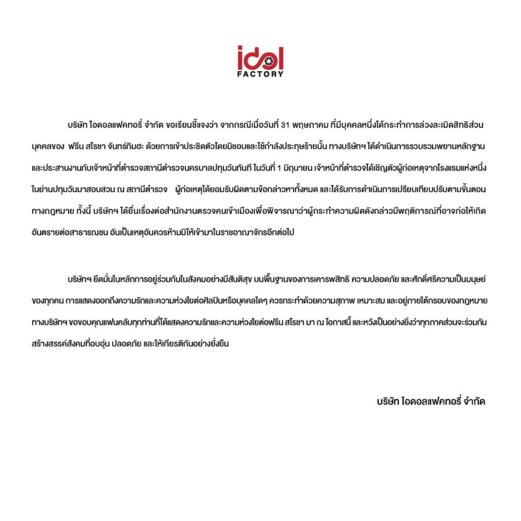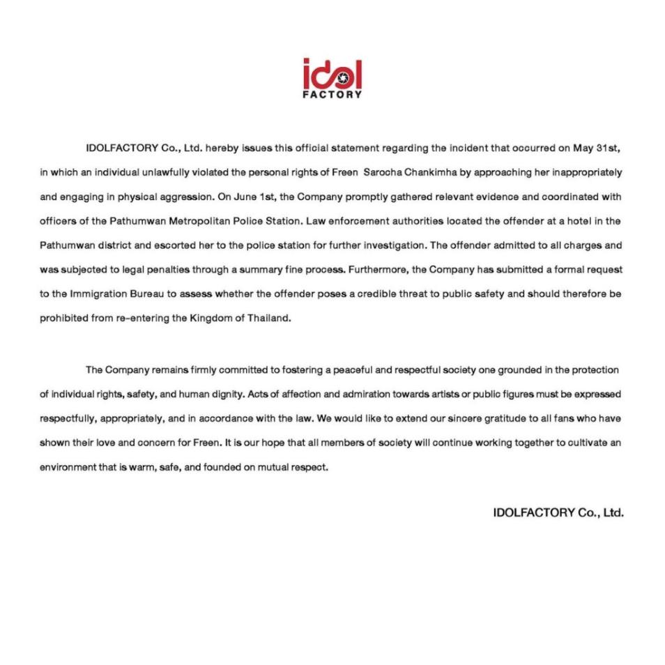 บริษัท ไอดอลแฟคทอรี่ จำกัด ขอเรียนชี้แจงว่า จากกรณีเมื่อวันที่ 31 พฤษภาคม ที่มีบุคคลหนึ่งได้กระทำการล่วงละเมิดสิทธิส่วนบุคคลของฟรีน สโรชา จันทร์กิมฮะ ด้วยการเข้าประชิดตัวโดยมิชอบและใช้กำลังประทุษร้ายนั้น ทางบริษัทฯ ได้ดำเนินการรวบรวมพยานหลักฐานและประสานงานกับเจ้าหน้าที่ตำรวจสถานีตำรวจนครบาลปทุมวันทันที ในวันที่ 1 มิถุนายน เจ้าหน้าที่ตำรวจได้เชิญตัวผู้ก่อเหตุจากโรงแรมแห่งหนึ่งในย่านปทุมวันมาสอบสวน ณ สถานีตำรวจ ผู้ก่อเหตุได้ยอมรับผิดตามข้อกล่าวหาทั้งหมด และได้รับการดำเนินการเปรียบเทียบปรับตามขั้นตอนทางกฎหมาย ทั้งนี้ บริษัทฯ ได้ยื่นเรื่องต่อสำนักงานตรวจคนเข้าเมืองเพื่อพิจารณาว่าผู้กระทำความผิดดังกล่าวมีพฤติการณ์ที่อาจก่อให้เกิดอันตรายต่อสาธารณชน อันเป็นเหตุอันควรห้ามมิให้เข้ามาในราชอาณาจักรอีกต่อไป