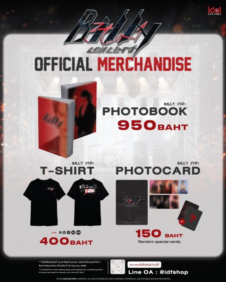 ที่จะพาแฟนๆมาเติมเต็มความฟิน ปล่อยใจปล่อยจอย ตะโกนสุดเสียงไปพร้อมกัน พร้อมทีเด็ดแขกรับเชิญตัวซีเคร็ทเอาใจมัมหมีและแฟนอินเตอร์ งานนี้พ่องานตัวจี๊ดอย่าง “หนุ่มบิลลี่” ทุ่มสุดตัว ทั้งร้อง ทั้งเต้น รอปล่อยของแน่นๆจุกๆ บอกเลยว่าโค้งสุดท้ายบัตรเหลือน้อยลงเต็มที่ รีบกดบัตรสำรองที่นั่งโซน Regular seat 2,000 บาท ได้ทาง thaiticketmajor.com เท่านั้น หรือสามารถรับชมแบบออนไลน์ ซื้อบัตร Live Stream 550 บาท บัตรมีจำนวนจำกัด ติดตามรายละเอียดได้เร็วๆนี้ พิเศษอีกขั้นพร้อมเสิร์ฟความรักมอบให้เพื่อแฟนๆสุดที่รัก กับของที่ระลึก “BILLY 3to1 CONCERT” โฟโต้บุ๊ค เสื้อยืด และ โฟโต้การ์ดแทนใจเพื่อแฟนๆ สนใจสั่งซื้อผ่าน LINE : @idfshop แล้วมาร่วมสร้างค่ำคืนอันแสนสนุกและน่าจดจำไปด้วยกัน