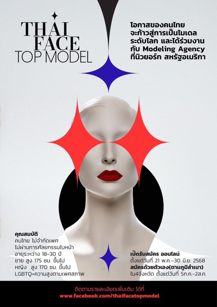 Thai Face Top Model (ไทย เฟซ ท็อป โมเดล) เวทีแห่งการให้ที่แท้จริง เพื่อโอกาสที่เท่าเทียมกันของคนไทยทั้งประเทศ ที่มีความใฝ่ฝันจะเป็นโมเดลมืออาชีพ จากความร่วมมือกันระหว่าง คณะกรรมการพัฒนาซอฟต์พาวเวอร์แห่งชาติร่วมกับ กรมประชาสัมพันธ์ โดยมี นพ.สุรพงษ์ สืบวงศ์ลี รองประธานคณะที่ปรึกษาด้านนโยบายของนายกรัฐมนตรี และประธานกรรมการพัฒนาซอฟต์พาวเวอร์แห่งชาติ เป็นประธานโครงการ ร่วมด้วยคุณสุดฤทัย เลิศเกษม อธิบดีกรมประชาสัมพันธ์ และคุณอินทิรา ทัพวงศ์ ผู้อำนวยการโครงการ โดยยังคงเปิดรับสมัครทางออนไลน์จนถึงวันที่ 30 มิ.ย.นี้ ทางลิ้งค์สมัคร https://forms.gle/aJGGmbKR2m1guETQ9 และเริ่มเปิดรอบออดิชั่น 4 ภาค ตั้งแต่วันที่ 5 – 27 ก.ค. 2568