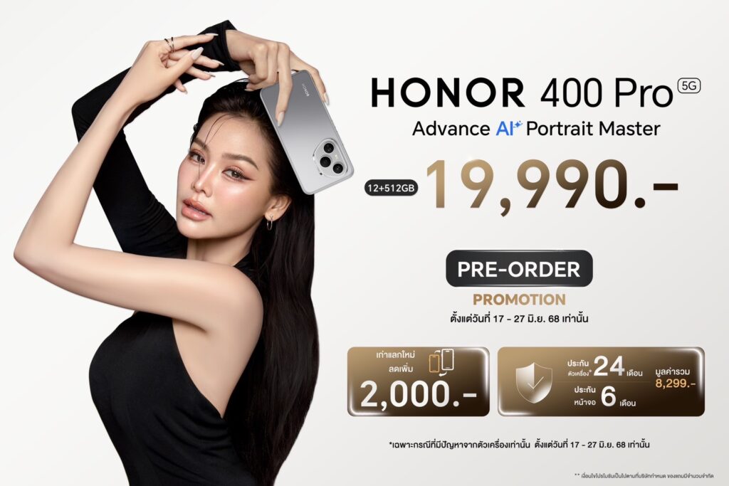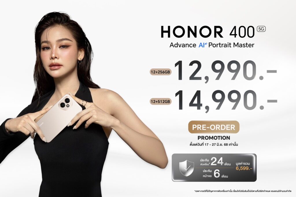 และ HONOR 400 มีให้เลือก 2 สี ได้แก่ สีทอง (Desert Gold) และสีดำ (Midnight Black) พร้อม 2 สเปกให้เลือกตามการใช้งาน ได้แก่ รุ่น 12GB+512GB ราคา 14,990 บาท และ รุ่น 12GB+256GB ราคา 12,990 บาท พิเศษ! Pre-order ระหว่างวันที่ 17 – 27 มิถุนายน 2568 รับสิทธิประโยชน์สุดคุ้ม อาทิ อัปเกรดความจุฟรี 2 เท่า จาก 256GB เป็น 512GB, ประกันตัวเครื่องนาน 24 เดือน และประกันหน้าจอแตกนาน 6 เดือน สั่งซื้อได้แล้ววันนี้ ผ่านแพลตฟอร์มออนไลน์ชั้นนำ Shopee: https://bitly.cx/tvuj , TikTok และ Lazada