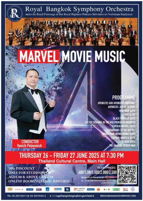 มูลนิธิรอยัลแบงค์คอกซิมโฟนีออร์เคสตร้า ในพระอุปถัมภ์สมเด็จพระเจ้าลูกเธอ เจ้าฟ้าสิริวัณณวรีนารีรัตนราชกัญญา จัดการแสดงคอนเสิร์ต Music from Marvel Studio ในวันพฤหัสบดีที่ 26 และวันศุกร์ที่ 27 มิถุนายน 2568 เวลา 19.30 น. ณ หอประชุมใหญ่ ศูนย์วัฒนธรรมแห่งประเทศไทย