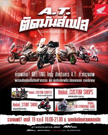 รถจักรยานยนต์ฮอนด้า เตรียมจัดงานมีตติ้งครั้งยิ่งใหญ่สำหรับคนพันธุ์ เอ.ที. กับงาน “A.T. ติดมันส์เฟส” ที่เปิดพื้นที่ให้ชาว เอ.ที. ทุกรุ่น ทุกค่ายทั่วกรุงเทพฯ ได้มารวมตัวพบปะกัน สัมผัสประสบการณ์ความมันส์แบบจัดเต็มกับกิจกรรมภายในงานที่จัดเตรียมให้ชาวเอ.ที. โดยเฉพาะ งานนี้เข้าร่วมงานได้ฟรี! ในวันเสาร์ที่ 19 กรกฎาคม 2568 เวลา 16.00 – 21.00 น. ณ ตลาดนัดเลียบด่วนแดนเนรมิต กรุงเทพฯ