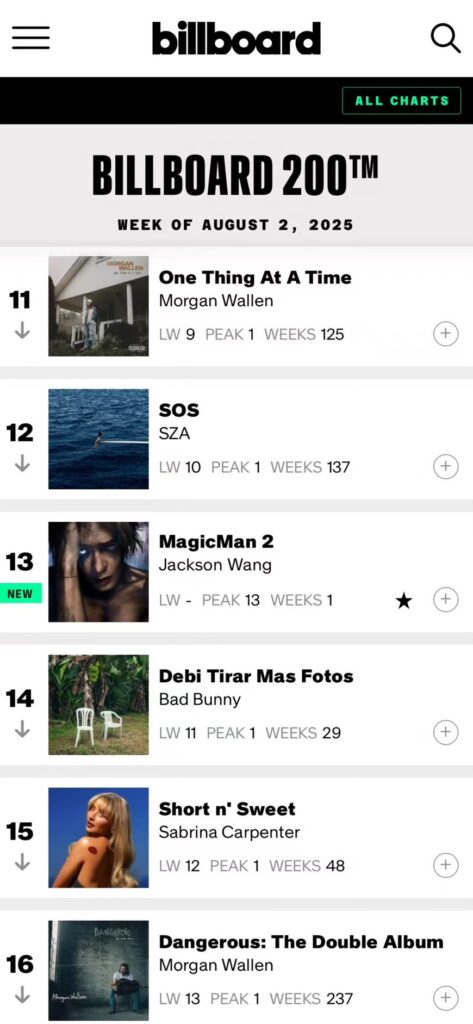 ปังอยู่! ปังต่อ! ปังให้โลกรู้! “แจ็คสัน หวัง” (JACKSON WANG) พาอัลบั้ม MAGICMAN 2 ที่เพิ่งปล่อยเมื่อวันที่ 18 กรกฎาคมที่ผ่านมา เปิดตัวแรงตั้งแต่สัปดาห์แรก ทะยานขึ้นอันดับ 13 บนชาร์ต Billboard 200 สร้างสถิติใหม่เป็นอัลบั้มเปิดตัวที่ทำอันดับสูงที่สุดจากศิลปินชาวจีนในประวัติศาสตร์ของชาร์ต Billboard 200