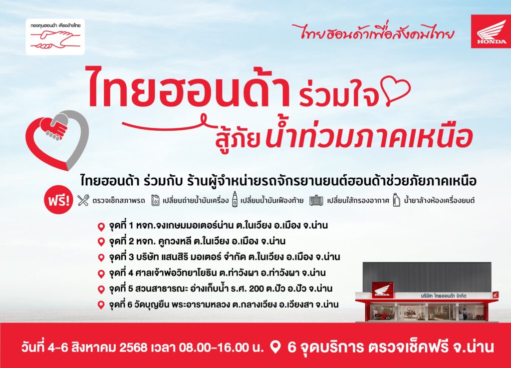 ไทยฮอนด้า ผู้ผลิตและจัดจำหน่ายรถจักรยานยนต์และเครื่องยนต์อเนกประสงค์ในประเทศไทย จับมือกับตัวแทนร้านผู้จำหน่ายรถจักรยานยนต์ฮอนด้า ร่วมบรรเทาความเดือดร้อนของประชาชนในพื้นที่ประสบอุทกภัย จัดกิจกรรมช่วยเหลือภายใต้โครงการ “ไทยฮอนด้าร่วมใจสู้ภัยน้ำท่วม” โดยจัดตั้งจุดให้บริการ Service Camp จำนวน 6 แห่งในจังหวัดน่าน พร้อมระดมทีมช่างผู้เชี่ยวชาญกว่า 80 คน ให้บริการตรวจเช็กและซ่อมแซมรถจักรยานยนต์ ฟรี ไม่มีค่าใช้จ่าย ระหว่างวันที่ 4 – 6 สิงหาคม 2568