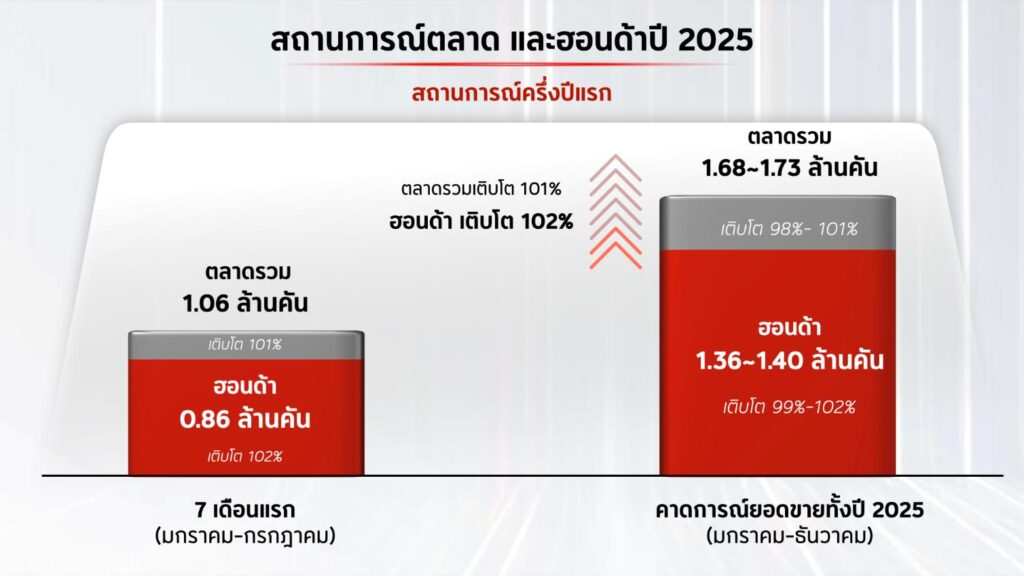 มร.ยูอิจิ ชิมิซุ ประธานกรรมการบริหารบริษัท ไทยฮอนด้า จำกัด กล่าวเปิดงาน “ในช่วงครึ่งปีที่ผ่านมา ไทยฮอนด้าได้เผชิญทั้งความท้าทายและโอกาส พร้อมก้าวผ่านช่วงเวลาสำคัญไปพร้อมกับลูกค้าและพันธมิตรทุกฝ่าย ในช่วงครึ่งปีแรก ยอดขายรวมของตลาดรถจักรยานยนต์อยู่ที่ 1.06 ล้านคัน หรือ เพิ่มขึ้น 101% เมื่อเทียบกับปีที่ผ่านมา ขณะที่ยอดขายของไทยฮอนด้าอยู่ที่ 0.86 ล้านคัน หรือ เติบโต 102% เมื่อเทียบกับช่วงเวลาเดียวกันของปีก่อน สำหรับตลาดรวมตลอดปี 2568 เราคาดการณ์เหมือนตอนต้นปีว่าจะมียอดขายรวมอยู่ที่ 1.68 ถึง 1.73 ล้านคัน หรือ เติบโตประมาณ 101% ส่วนไทยฮอนด้าตั้งเป้ายอดขายไว้ที่ 1.36 ถึง 1.40 ล้านคัน หรือราว 102% เมื่อเทียบกับปีก่อน ซึ่งสะท้อนถึงความเชื่อมั่นของผู้บริโภคที่มีต่อผลิตภัณฑ์และบริการของฮอนด้าอย่างต่อเนื่อง”