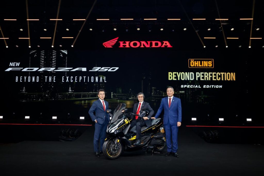 และอีกหนึ่งไฮไลต์สำคัญอย่างรถจักรยานยนต์ ‘New Honda Forza 350 Special Editionx Öhlins’ เปิดตัวภายใต้คอนเซปต์ ‘BEYOND PERFECTION ก้าวข้ามความสมบูรณ์แบบที่เหนือระดับ’ ที่ได้ร่วมมือกับ Öhlins แบรนด์ผู้นำด้านเทคโนโลยีช่วงล่างระดับโลก มาพร้อมชุดโช้กอัพ Öhlins Special Edition รองรับทุกจังหวะการขับขี่ด้วยความนุ่ม หนึบ และมั่นใจทุกทางโค้ง ด้วยดีไซน์สีทองอันเป็นเอกลักษณ์ โดดเด่นด้วยหัวโช้คดีไซน์ใหม่ที่ทันสมัย และสติ๊กเกอร์ Blue Logo สะดุดตา รวมถึงตัวปรับโช้ค Gold Compression Adjuster ที่ปรับแต่งได้ละเอียดและโดดเด่นไม่เหมือนใคร และฝาท้ายโช้ค Gold End Cap ที่เติมเต็มความหรูหราอย่างสมบูรณ์แบบ