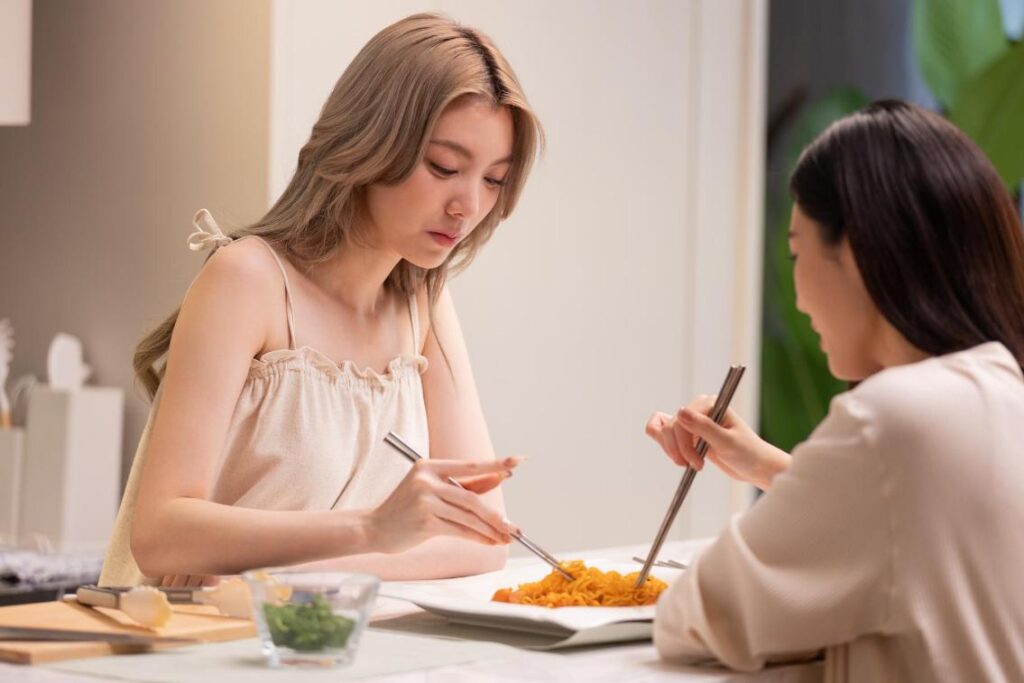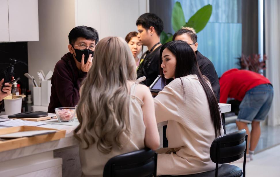 ก่อนเข้าฉาก ผู้กำกับ พี่นาย-สรัสวดี ขอจัดติวเข้มสเต็ปการทำอาหารแบบละเอียดยิบ แต่ระหว่างที่ “เชฟออม” กำลังตั้งใจฟังบรีฟก็ดูจะอินเกินเบอร์ เผลอหยิบไส้กรอกมากินไปพลาง ๆ จนทีมงานยังแซวว่า…จะเหลือไว้เข้าฉากมั้ย? พี่นายแอบกระซิบว่าซีนนี้อาจจะไม่ยากในแง่บทพูด แต่ที่ท้าทายจริง ๆ คือขั้นตอนการทำอาหาร ที่ต้องลงมือเองทุกระเบียบ ทางด้าน หลิง ถึงกับออกอาการกังวลไม่น้อย หลังรู้ว่าออมเป็นคนชอบทำอาหาร แต่ไม่ยอมรับตรง ๆ ว่า “ทำไม่ค่อยเก่ง” งานนี้บอดี้การ์ดเลยขอทวนสูตรกับน้องออมอีกรอบ เพื่อความมั่นใจก่อนลุยเข้าฉากจริง