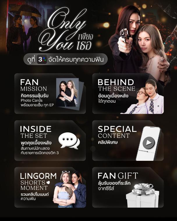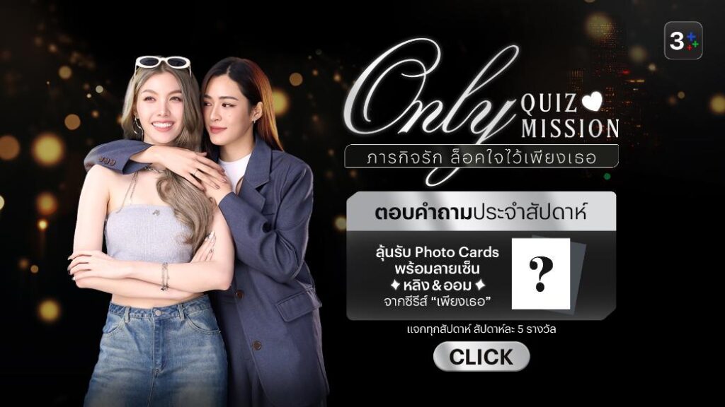 ร่วมสนุกกับกิจกรรม “Only Quiz Mission” ได้ง่าย ๆ เพียงตอบคำถามประจำสัปดาห์เกี่ยวกับเนื้อหาใน EP ที่เพิ่งดูจบ ผ่านเว็บไซต์หรือแอป 3Plus ลุ้นรับ Photo Cards สุดเอ็กซ์คลูซีฟพร้อมลายเซ็นจาก “หลิง & ออม” แจกทุกสัปดาห์ 5 รางวัล / รางวัลละ 1 ใบ