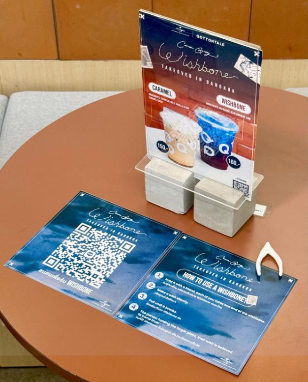 และพิเศษสุด ๆ กับครั้งแรกในไทย สำหรับใครที่ซื้อ Wishbone Specialty Drinks เมนูใดก็ได้ สามารถลงทะเบียนเพื่อแลกรับ Wishbone ของจริงได้ฟรี! สามารถสแกน QR Code ที่ร้าน Qottontale และแลกรับของขวัญสุดพิเศษนี้ที่หน้าร้านได้เลย (มีจำนวนจำกัด)