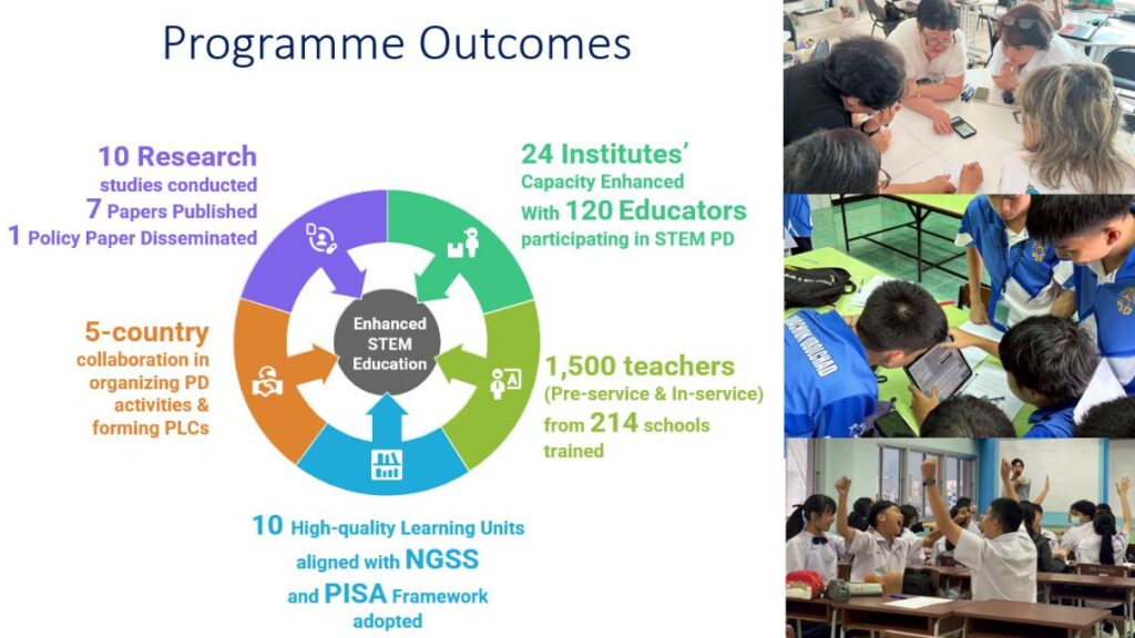 “ตลอดระยะเวลาดำเนินโครงการกว่า 2 ปี SEAMEO STEM-ED ได้ทำงานร่วมกับหน่วยงานใน 5 ประเทศ เพื่อพัฒนาการเรียนการสอนสะเต็มอย่างเป็นรูปธรรม ผ่านการใช้สื่อการเรียนรู้ที่มีคุณภาพ โดยสามารถถ่ายทอดองค์ความรู้ให้กับครูต้นแบบมากกว่า 120 คน จาก 24 มหาวิทยาลัยและสถาบันพัฒนาครู ซึ่งครูเหล่านี้ได้ขยายผลการเรียนรู้ต่อให้กับนิสิตนักศึกษาครูและครูประจำการกว่า 1,500 คน ในโรงเรียนกว่า 214 แห่ง โดยโครงการดังกล่าว มีบทบาทสำคัญในการยกระดับมาตรฐานการจัดการเรียนการสอนด้านสะเต็มในประเทศที่เข้าร่วมโครงการ อีกทั้งยังเป็นต้นแบบความร่วมมือระดับภูมิภาคที่มีศักยภาพในการพัฒนาครูและการศึกษาให้เดินหน้าอย่างยั่งยืน” ดร.เกศรา กล่าวเสริมถึงความสำเร็จของโครงการฯ