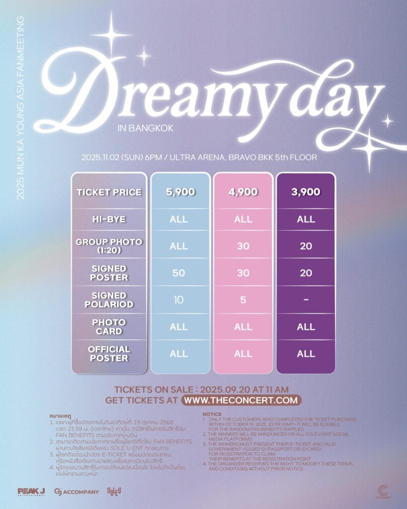 แฟน ๆ ชาวไทยเตรียมล็อควันปักหมุดกดบัตรพร้อมกัน ในวันเสาร์ที่ 20 กันยายน 2568 เวลา 11.00 น. เป็นต้นไป ซื้อบัตรได้ที่ https://www.theconcert.com/concerts/2025-mun-ka-young-asia-fanmeeting-in-bangkok