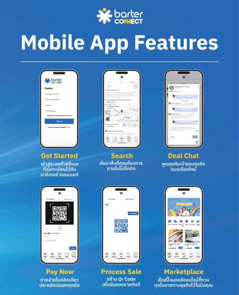 สำหรับBarter Connect Mobile App ถูกพัฒนาขึ้นจากการวิเคราะห์พฤติกรรมการใช้งานของเจ้าของธุรกิจ โดยมีฟีเจอร์หลักที่ตอบโจทย์ความต้องการเฉพาะ