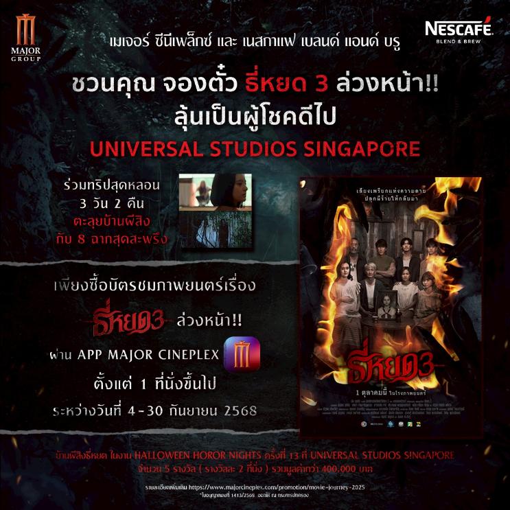 เตรียมใจให้พร้อม แล้วบินลัดฟ้าสู่ประสบการณ์ขนหัวลุกที่คุณจะไม่มีวันลืม เมื่อ เมเจอร์ ซีนีเพล็กซ์ ร่วมกับ บริษัท เนสท์เล่ (ไทย) จำกัด ชวนคุณร่วมทริปสุดพิเศษ ลุ้นบินฟรี! เที่ยว “Universal Studios Singapore” พร้อมเข้าสู่ “บ้านผีสิงธี่หยด” ที่จำลองความหลอนจากในภาพยนตร์มาไว้ใจกลางสวนสนุกชื่อดังของสิงคโปร์ กติกาเพียงจองบัตรชมภาพยนตร์ ธี่หยด 3 ล่วงหน้า ผ่านแอปพลิเคชัน Major Cineplex จำนวน 1 ที่นั่งขึ้นไป จองได้ตั้งแต่วันนี้ – 30 กันยายน 2568 มีสิทธิ์ลุ้นรับ 5 รางวัล รางวัลละ 2 ที่นั่ง ร่วมบินลัดฟ้าไปสัมผัสความสยองที่งาน Halloween Horror Nights 13 แบบ 3 วัน 2 คืน เดินทางในวันที่ 31 ต.ค. – 2 พ.ย. 68 พร้อมที่พัก, ตั๋วเครื่องบินไป-กลับ และบัตรเข้า Universal Studios Singapore รวมมูลค่ากว่า 400,000 บาท