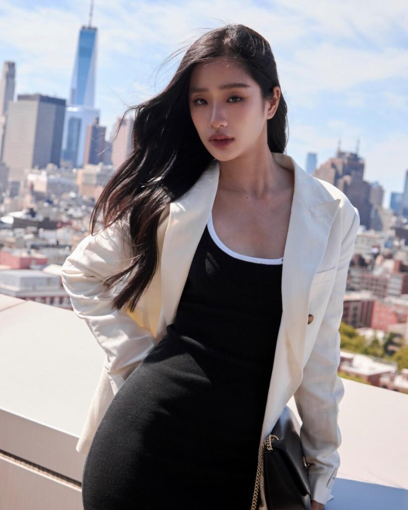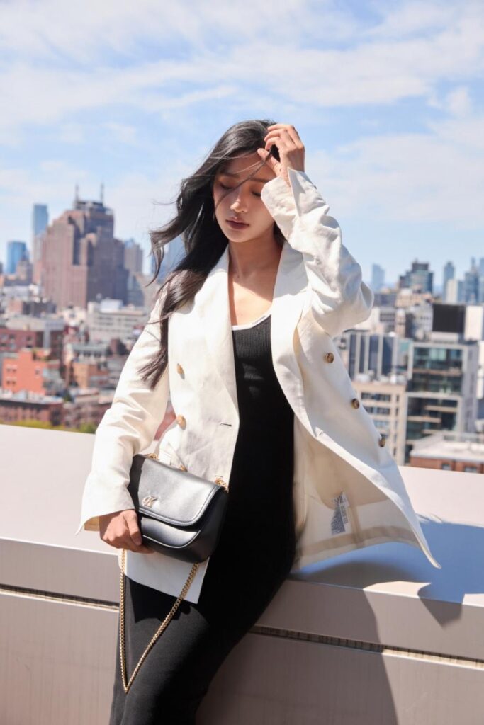 ด้าน ตู-ต้นตะวัน มาในลุค Classsic Style ที่สะท้อนเสน่ห์แห่งความเรียบหรูและโมเดิร์น ด้วยเดรสสีดำเข้ารูป เพิ่มเลเยอร์ด้วยเบลเซอร์ทรงโอเวอร์ไซส์สีขาว พร้อมคอมพลีทลุคด้วยรองเท้าหนังส้นเตี้ยและกระเป๋าใบเล็กสีดำ เติมเต็มความคลาสสิกแบบหรูหราให้กับลุคนี้ท่ามกลางวิวมหานคร