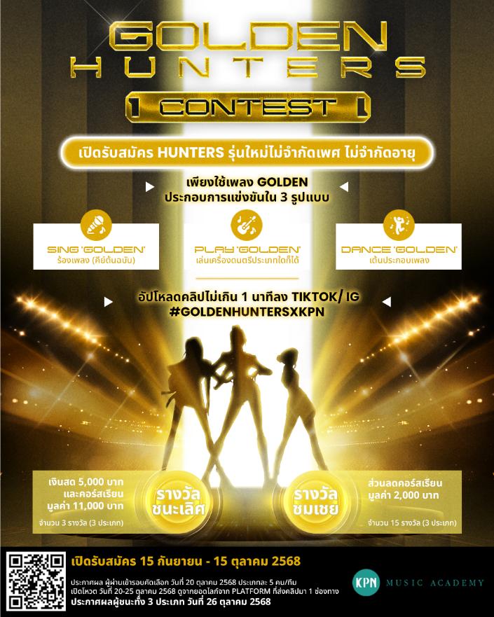 ได้เวลารวมตัว Hunters จากทั่วประเทศ Universal Music Thailand ชวนเหล่านักล่าปิศาจคนเก่ง สร้างฮอนมูนสีทองจากเพลง “Golden” เพื่อค้นหาสุดยอด Golden Hunters คว้ารางวัลใหญ่จาก KPN Music Academy ไปครองกันแบบง่าย ๆ ในกิจกรรม KPN Golden Hunters