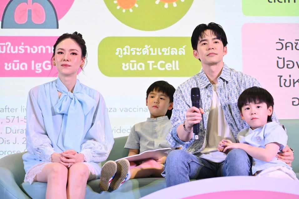 ปิดท้ายด้วย บีม-กวี ตันจรารักษ์ คุณพ่อลูกแฝด 4 เล่าประสบการณ์เวลาลูกป่วยว่า “เวลาลูกป่วยก็จะสงสารเขา คือพีร์และธีร์อยู่ในช่วงวัยเรียน ถ้าหยุดเรียน เขาจะพลาดประสบการณ์บางอย่างไป ผมเลยไม่อยากให้หยุดเรียน ลูกเรามี 4 คนจะทำอย่างไรให้ 3 คนไม่ติดไปด้วย แต่ผู้ใหญ่นี่ติดแน่ๆ ผมนอนกับลูกชายก็จะติดไปด้วย ป่วยทีก็เป็นอาทิตย์ แล้วติดวนไป เพราะคนที่บ้านเยอะ แล้วก็สงสารออยเพราะเหนื่อยมาก เขาต้องดูแลทุกคน ก็เลยไม่อยากให้ลูกป่วย ดังนั้นวัคซีนไหนที่จำเป็นต้องฉีดก็ฉีดไม่ให้ขาด หรือต้องฉีดเป็นประจำทุกปี ฉีดแล้วก็ทำให้ชีวิตเราง่ายขึ้นและแข็งแรง อย่างนวัตกรรมที่ช่วยป้องกันไข้หวัดใหญ่ด้วยวัคซีนแบบพ่นจมูก ผมว่าเป็นทางเลือกที่ดีนะ ลองคิดดูว่า 4 แฝดเรียงคิวฉีดยา พอคนแรกโดน คนอื่นๆ ก็จะหงอกันแล้ว ถ้าเป็นแบบพ่นจมูก ชีวิตน่าจะง่ายขึ้น เพราะเด็กๆ คุ้นชินกับการล้างจมูกและพ่นจมูกปกติ”