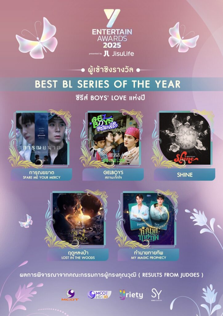 Best BL Series of the Year (ซีรีส์ Boys’ Love แห่งปี) การุณยฆาต SPARE ME YOUR MERCY, GELBOYS สถานะกั๊กใจ, Shine, ฤดูหลงป่า Lost in the Woods, ทำนายทายทัพ My Magic Prophecy