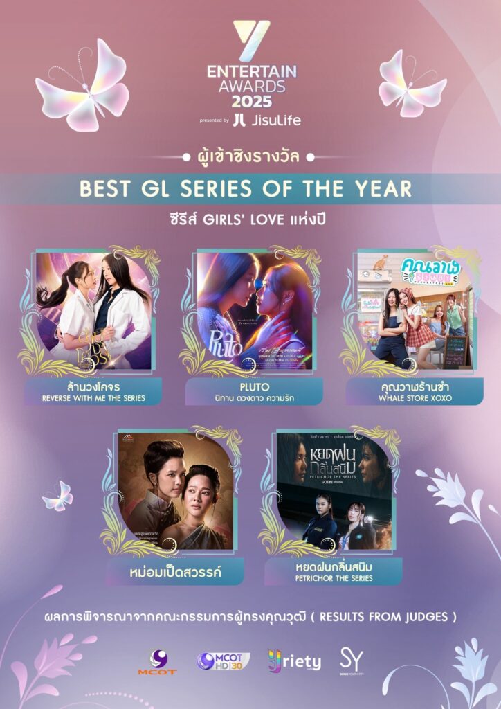 Best GL Series of the Year (ซีรีส์ Girls’ Love แห่งปี) ล้านวงโคจร Reverse with Me The Series, Pluto นิทาน ดวงดาว ความรัก, คุณวาฬร้านชำ Whale Store xoxo, หม่อมเป็ดสวรรค์, หยดฝนกลิ่นสนิม Petrichor The Series