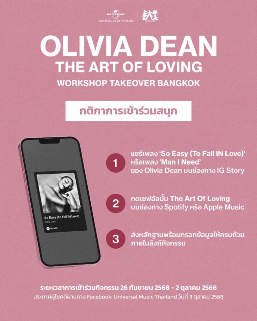 ข่าวดี! แฟน ๆ สามารถลุ้นเข้าร่วมกิจกรรมเวิร์คช็อปที่ Bask Project ได้ฟรี! จำนวน 4 ท่าน พร้อมรับของรางวัลพิเศษมากมาย เพียงแชร์เพลง “So Easy (To Fall In Love)” ของ Olivia Dean ลงใน Instagram Story กดเซฟอัลบั้มใน Spotify หรือ Apple Music และกรอกข้อมูลในลิงค์ลงทะเบียนให้ครบ ก็ลุ้นเป็นหนึ่งในผู้โชคดีกันได้แล้ว ดูรายละเอียดเพิ่มเติมได้ที่ Facebook: Universal Music Thailand