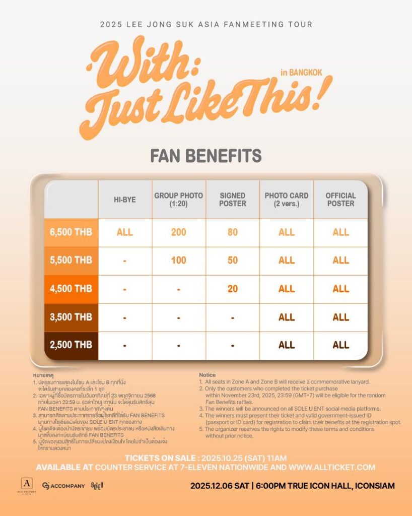 SOLE U ENTERTAIN (โซลยูว์ เอ็นเตอร์เทน) ผู้จัดมากประสบการณ์ เตรียมสร้างเซอร์ไพรส์ครั้งใหม่ คว้า “อีจงซอก” นักแสดงหนุ่มซูเปอร์สตาร์เกาหลีใต้ บินลัดฟ้าคัมแบ็คประเทศไทยจัดงานแฟนมีตติ้งสุดเอ็กซ์คลูซีฟที่แฟน ๆ รอคอย “2025 LEE JONG SUK ASIA FANMEETING TOUR [With : Just Like This] in BANGKOK” อีจงซอกพร้อมแล้วที่จะมอบโมเมนต์สุดฟิน สุดอิน จัดเต็มทุกวินาที ในวันเสาร์ที่ 6 ธันวาคม 2568 เวลา 18.00 น. ณ TRUE ICON HALL, 7th FLOOR, ICONSIAM เหล่าชาวด้อม With ไม่ควรพลาด!