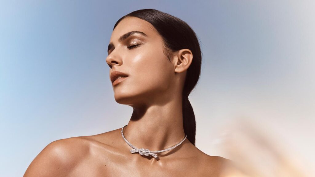 ทองคำสีไวท์โกลด์และทองคำสีพิงค์โกลด์ถูกเผยความงดงามผ่านเครื่องประดับ 3 ชิ้น ได้แก่ แหวน สร้อยคอ และต่างหู ซึ่งถ่ายทอดเสน่ห์อันสดใสของ Chance Infinie ได้อย่างลงตัว สามารถสวมใส่ในรูปทรงเลข 8 หรือหมุนกลับด้านเป็นสัญลักษณ์อินฟินิตี้โดดเด่นด้วยเพชรทรงหยดน้ำเม็ดกลางรายล้อมด้วยเพชรพาเว่ เส้นสายโค้งมนพลิ้วไหวชวนให้สวมใส่ได้ในทุกวัน พร้อมเติมประกายอย่างเป็นธรรมชาติให้กับผิว