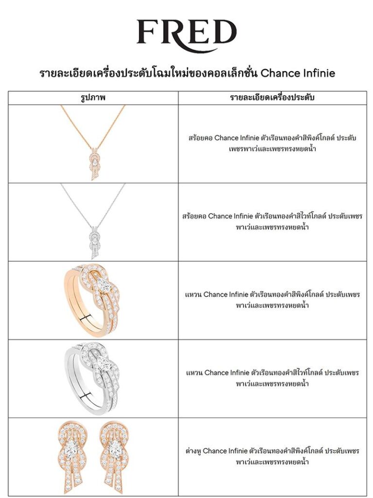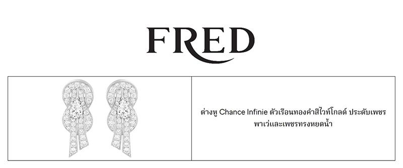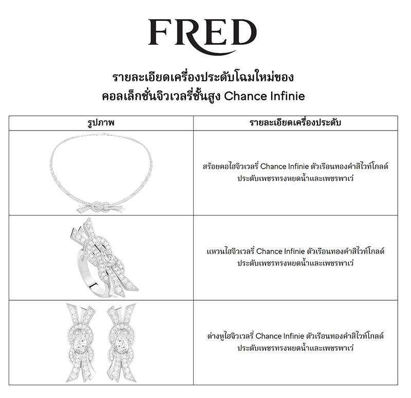 เพียงเอ่ยชื่อก็ชวนให้นึกถึงจิตวิญญาณแห่งความมั่นใจและความศรัทธาในโชคชะตา เพื่อเป็นเกียรติแด่ผู้ก่อตั้ง บทบรรจงนี้ชวนให้เรามองเห็นมุมมองด้านดีในทุกสถานการณ์ เฉกเช่นเดียวกับที่เฟร็ด ซามูเอลใช้ชีวิตด้วยความมุ่งมั่นและทัศนคติอันเปี่ยมด้วยความหวัง ลวดลายอันเป็นเอกลักษณ์ของคอลเล็กชั่น Chance Infinie สื่อถึงสัญลักษณ์แห่งความโชคดีที่เปี่ยมด้วยจิตวิญญาณแห่งการปกป้อง ด้วยรูปทรงเลขแปดแนวนอนที่มีความหมายลึกซึ้งต่อชีวิตของเฟร็ด ซามูเอล ผู้ซึ่งเกิดในเดือนที่แปดของปี ค.ศ. 1908 และยังสะท้อนถึงสัญลักษณ์อินฟินิตี้ ซึ่งเป็นนามธรรมสากลแห่งความไม่มีที่สิ้นสุด ลวดลายดั้งเดิมนี้ได้รับแรงบันดาลใจจากความเชื่อมั่นที่ว่า ทุกช่วงเวลาคือโอกาสแห่งความสุข โอกาสที่ควรคว้าไว้ และสร้างโชคชะตาด้วยตนเอง ในปี 2025 นี้ เมซง FRED จึงได้ตีความเสน่ห์อันอ่อนช้อยของผลงานสร้างสรรค์ในคอลเล็กชั่นนี้ใหม่ พร้อมปลุกพลังแห่งความเปล่งประกายที่ซ่อนอยู่ในผู้หญิงทุกคน ให้เผยออกมาอย่างงดงามในทุกโอกาสอีกครั้ง