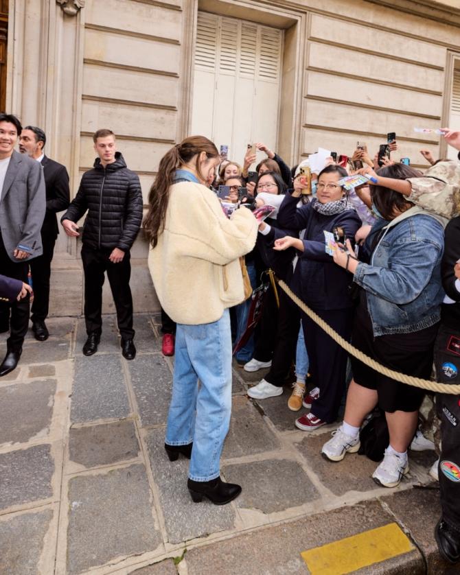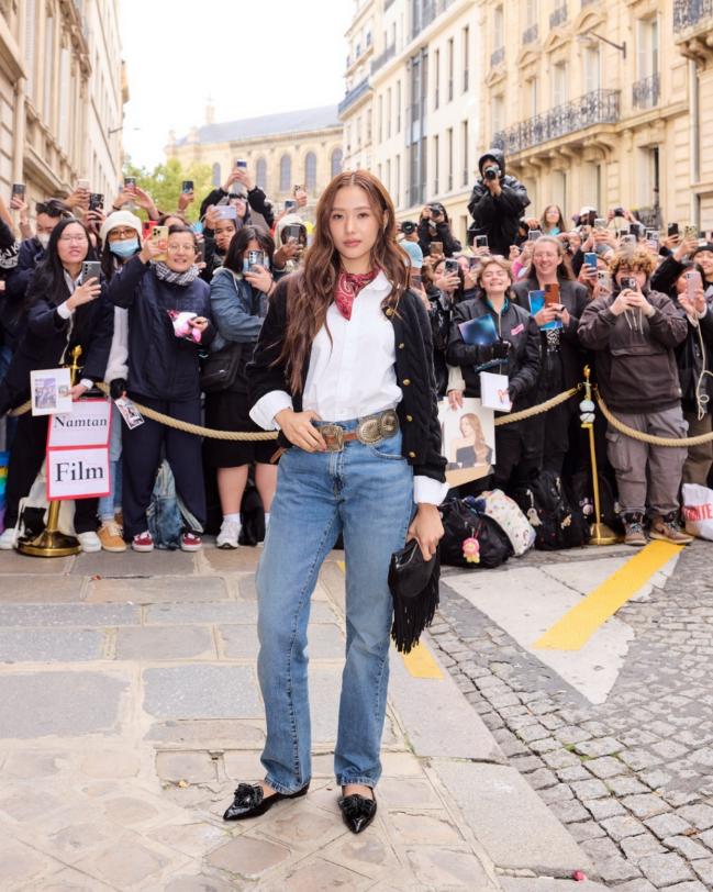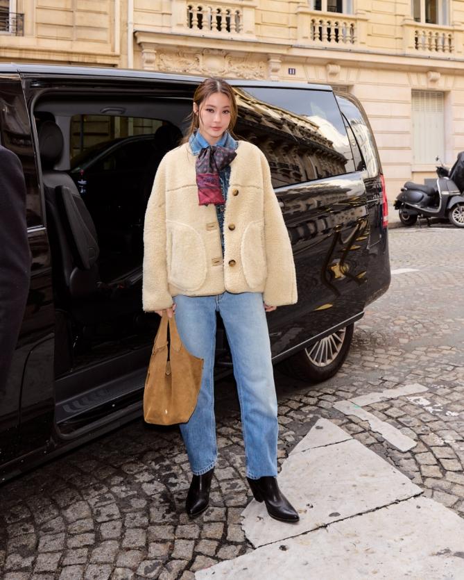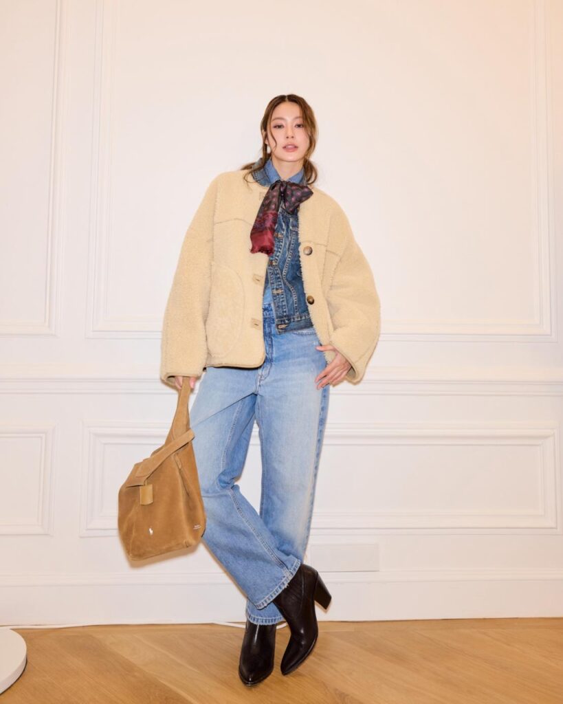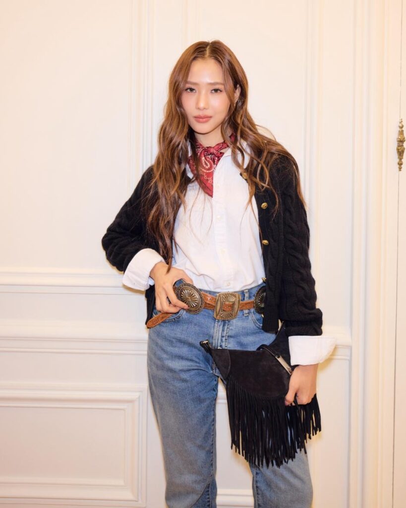 โดย น้ำตาล–ทิพนารี ปรากฏตัวในลุค Western Denim เติมความเท่ด้วยแจ็กเก็ตขนเฟอร์แต่งหนัง ผ้าพันคอ และกระเป๋า Polo Play หนังกลับ