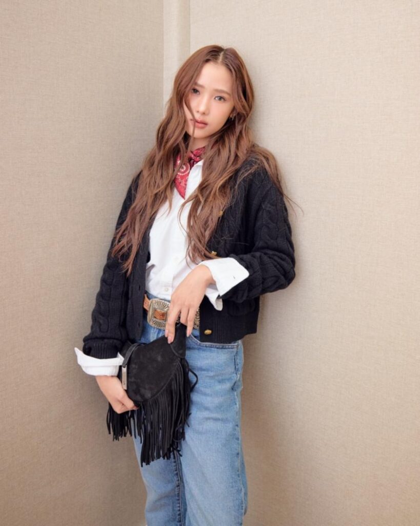 ขณะที่ ฟิล์ม–รชานันท์ ถ่ายทอดอีกมุมของเดนิมในโทนเรียบหรู จับคู่เชิ้ตขาวกับคาร์ดิแกนถักสีดำ เสริมด้วยผ้าพันคอโบว์สีแดงและ Fringe ID Bag ที่ช่วยยกระดับลุคให้หรูสง่าและร่วมสมัย