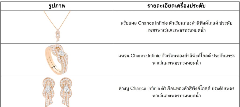 Chance Infinie ถูกตีความใหม่ผ่านลวดลายอันอ่อนช้อยของอินฟินิตี้หรือเลข 8 ผสานเข้ากับเส้นริบบิ้นที่ปลายคลายออกอย่างประณีต แปรเปลี่ยนสัญลักษณ์นำโชคนี้ให้กลายเป็นโบว์ที่เปี่ยมด้วยความพลิ้วไหวและเสน่ห์ละมุนละไม โดดเด่นด้วยเพชรทรงหยดนํ้าเม็ดกลางรายล้อมด้วยเพชรพาเว่บนตัวเรือนทองคำสีไวท์โกลด์หรือทองคำสีพิงค์โกลด์ ทั้งในแหวน สร้อยคอ และต่างหู พร้อมปลุกพลังแห่งความเปล่งประกายที่ซ่อนอยู่ในผู้หญิงทุกคนให้เผยออกมาอย่างสง่างามในทุกโอกาส และสดุดีแด่เสน่ห์อันเปล่งประกายดั่งแสงอาทิตย์ของผู้หญิงซึ่งทั้งอ่อนโยนและกล้าหาญในแบบของตนเอง