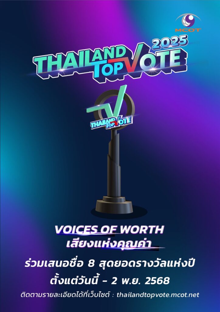 ใครคือผู้ที่จะก้าวเข้าสู่ TOP 5 ของประเทศ ในแต่ละสาขา ปล่อยเสียงที่อยู่ในใจของคุณ ให้เป็นเสียงแห่งคุณค่า ร่วมเสนอชื่อ “Thailand Top Vote 2025” VOICES OF WORTH ติดตามรายละเอียดขั้นตอนการร่วมเสนอชื่อ ได้ทาง https://thailandtopvote.mcot.net/