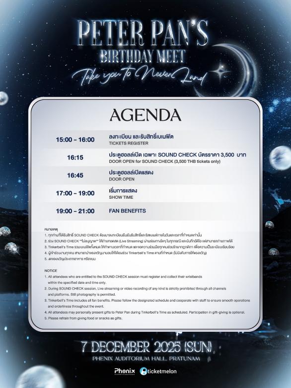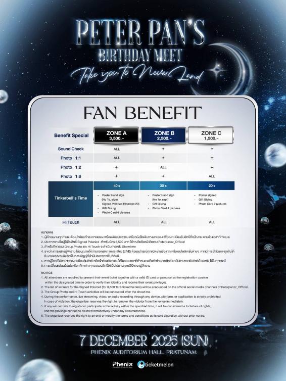 เตรียมวอร์มนิ้วกดบัตรกันได้ ในวันเสาร์ที่ 25 ตุลาคม 2568 ตั้งแต่เวลา 18.00 น. เป็นต้นไป ผ่านทางเว็บไซต์ www.ticketmelon.com บัตรราคา 3,500 บาท / 2,500 บาท และ 1,500 บาท พร้อมรับสิทธิเบเนฟิตทุกที่นั่ง แฟน ๆ สามารถติดตามรายละเอียดเพิ่มเติมได้ที่ FB / IG / X : @Peterpanzz_Official เตรียมหัวใจคุณให้พร้อมแล้วไปท่องดินแดน NeverLand ด้วยกัน