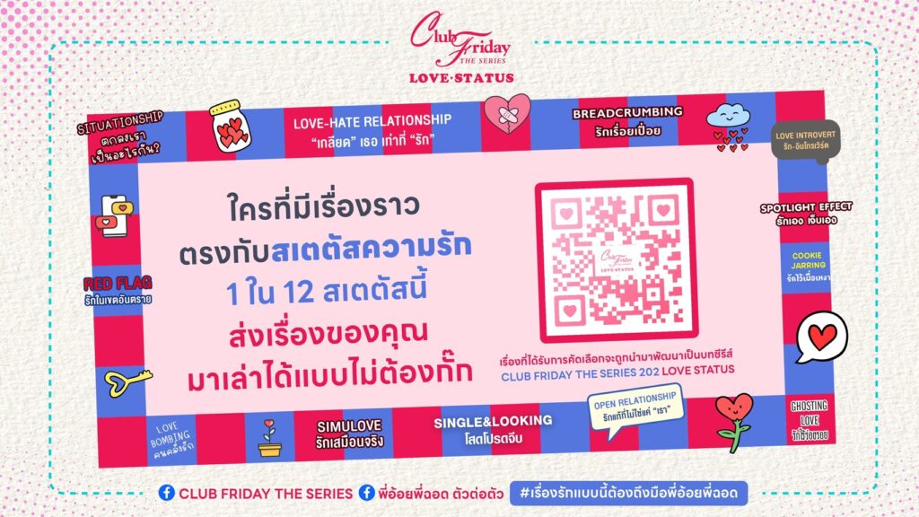 “ความรักเป็นเรื่องของคนทุก GEN” และ “ความสัมพันธ์” คือสิ่งที่เปลี่ยนแปลงไปตามยุคสมัย ปี 2026 นี้ “CLUB FRIDAY THE SERIES” จาก CHANGE2561 ในรูปแบบใหม่ที่สะท้อน “สถานะความรัก” ของคนยุคดิจิทัล ผ่านโปรเจกต์ “CLUB FRIDAY THE SERIES : LOVE STATUS” ที่จะถ่ายทอด 12 เรื่องรัก 12 สถานะ ตลอดทั้ง 12 เดือน โดยมีนักแสดงชั้นนำ 12 คู่ มาร่วมถ่ายทอดหลากมุมมองของหัวใจคนยุคใหม่