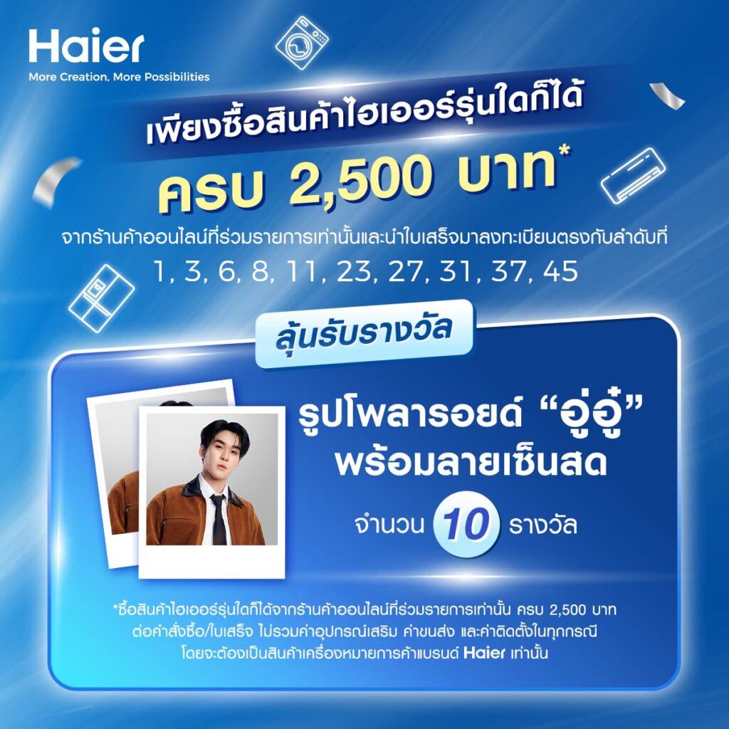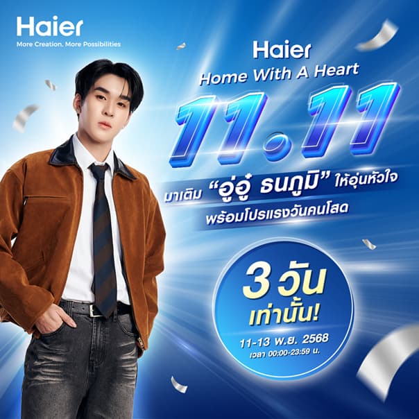 ถึงเวลามาเติมฟิน! เตรียมพบกับมหกรรมความสุขส่งท้ายปีอย่างจุใจจาก ไฮเออร์ ที่ชวนหนุ่มหล่อหน้าตาจิ้มลิ้มกระแสแรงแห่งยุค “อู่อู๋ ธนภูมิ เศรษฐสิทธิกุล” มาร่วมเสิร์ฟความสนุก และยกทัพสินค้าดีโปรโมชันเด็ดจากไฮเออร์เพื่อทุกคน ในกิจกรรม Haier Home With A Heart 11.11 มาเติม “อู่อู๋ ธนภูมิ” ให้อุ่นหัวใจ พร้อมโปรแรงวันคนโสด สำหรับโปรโมชันประจำเดือน 11.11 นี้ ห้ามพลาด! ช้อปสินค้าไฮเออร์รุ่นใดก็ได้ ครบ 2,500 บาท และลงทะเบียนตรงกับลำดับที่ 1, 3, 6, 8, 11, 23, 27, 31, 37, 45 รับฟรี! รูปโพลารอยด์ “อู่อู๋ ธนภูมิ เศรษฐสิทธิกุล” พร้อมลายเซ็นสดสุดพิเศษ โดยสามารถร่วมกิจกรรมได้ตั้งแต่วันที่ 11 – 13 พฤศจิกายน 2568 พร้อมประกาศรายชื่อผู้โชคดีที่ได้รับรางวัล จำนวน 10 ท่าน ในวันที่ 27 พ.ย. 2568 เวลา 17:00 น. ผ่านทาง Facebook : Haier Thailand สามารถติดตามรายละเอียดและกติกาการร่วมสนุกของกิจกรรมเพิ่มเติม ได้ที่ Facebook Haier Thailand: https://www.facebook.com/HaierThailand