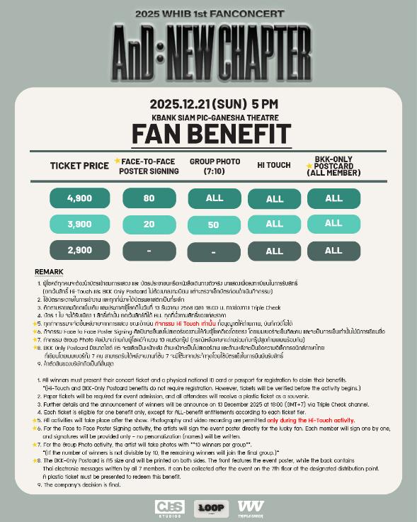 โดยงาน “WHIB 1st FANCON [AnD : New Chapter] In Bangkok” จะเปิดจำหน่ายบัตรในวันอาทิตย์ที่ 30 พฤศจิกายน 2568 ตั้งแต่เวลา 11.00 น. เป็นต้นไป ทางเว็บไซต์ www.triplech.com ราคาบัตรอยู่ที่ 4,900 / 3,900 / 2,900 บาท บัตรทุกราคาจะได้รับสิทธิ์ Hi Touch และโปสการ์ดพิเศษ BKK-Only Postcard (All Member) ที่จัดทำขึ้นเฉพาะแฟนคอนในกรุงเทพเท่านั้น! พิเศษสุดสำหรับผู้ถือบัตรราคา 4,900 บาท รับสิทธิ์ถ่าย Group Photo (7:10) ทุกท่าน พร้อมรับสิทธิ์สุ่มผู้โชคดี 80 ท่าน เพื่อรับโปสเตอร์ที่ศิลปินจะเซ็นให้เองกับมือ ส่วนผู้ถือบัตรราคา 3,900 บาท ก็มีสิทธิ์ลุ้นรับโปสเตอร์ที่ศิลปินจะเซ็นให้เองกับมือเช่นกันอีก 20 ท่าน และได้รับสิทธิ์สุ่มถ่าย Group Photo (7:10) จำนวน 50 ท่านด้วย