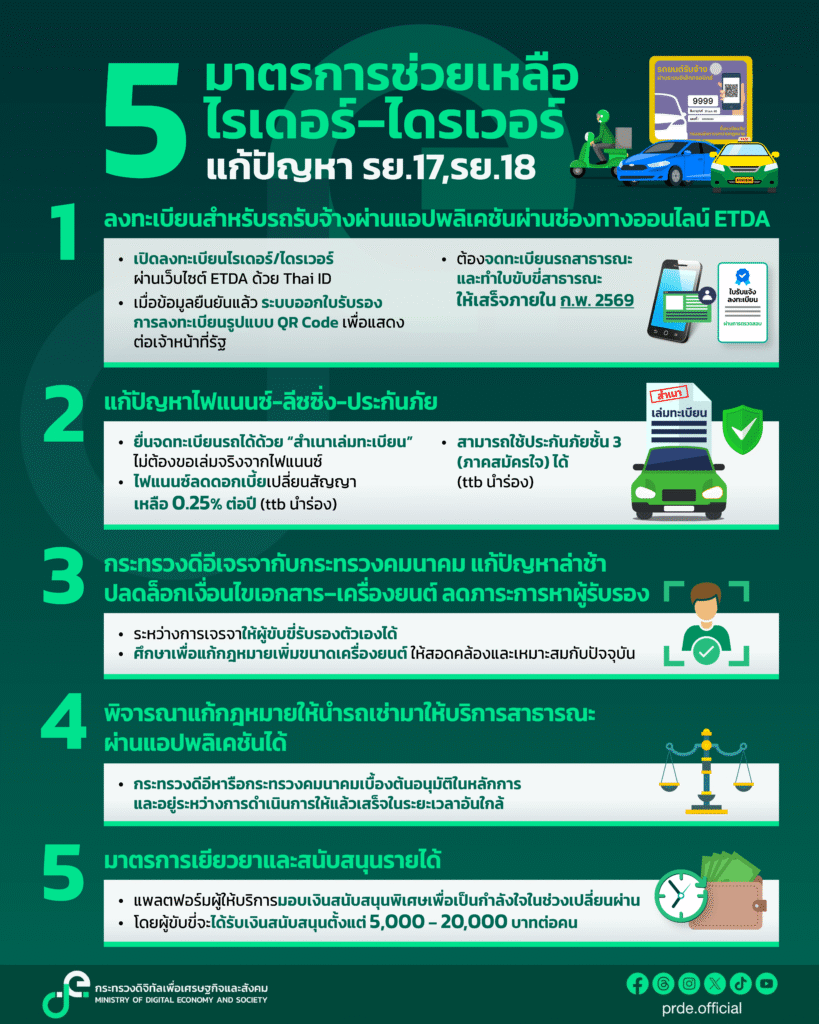 นายไชยชนก ชิดชอบ รัฐมนตรีว่าการกระทรวงดิจิทัลเพื่อเศรษฐกิจและสังคม (MDES) กล่าวว่า “ประกาศเรื่องรถรับจ้างผ่านระบบอิเล็กทรอนิกส์ (รย.17 และ รย.18) ส่งผลกระทบโดยตรงต่อผู้ขับขี่กว่า 200,000 รายที่เป็นฟันเฟืองสำคัญของเศรษฐกิจดิจิทัล กระทรวงฯ รับทราบถึงข้อกังวลและอุปสรรคหน้างาน ทั้งเรื่องเอกสารสิทธิ์ รถติดไฟแนนซ์ ค่าใช้จ่ายประกันภัยที่สูงขึ้นรวมถึงข้อจำกัดทางเทคนิคต่างๆ หลังจากรับข้อร้องเรียนมาแล้ว กระทรวงดีอีจึงไม่ได้นิ่งนอนใจและได้เร่งหารือกับกรมการขนส่งทางบก, ETDA สถาบันการเงิน และภาคเอกชน จนได้แนวทางแก้ไขปัญหาเร่งด่วน 5 มาตรการ เพื่อช่วยปลดล็อกผู้ประกอบอาชีพขับรถรับจ้างผ่านแอปพลิเคชันให้สามารถเข้าสู่ระบบได้อย่างถูกต้องและเป็นธรรม”