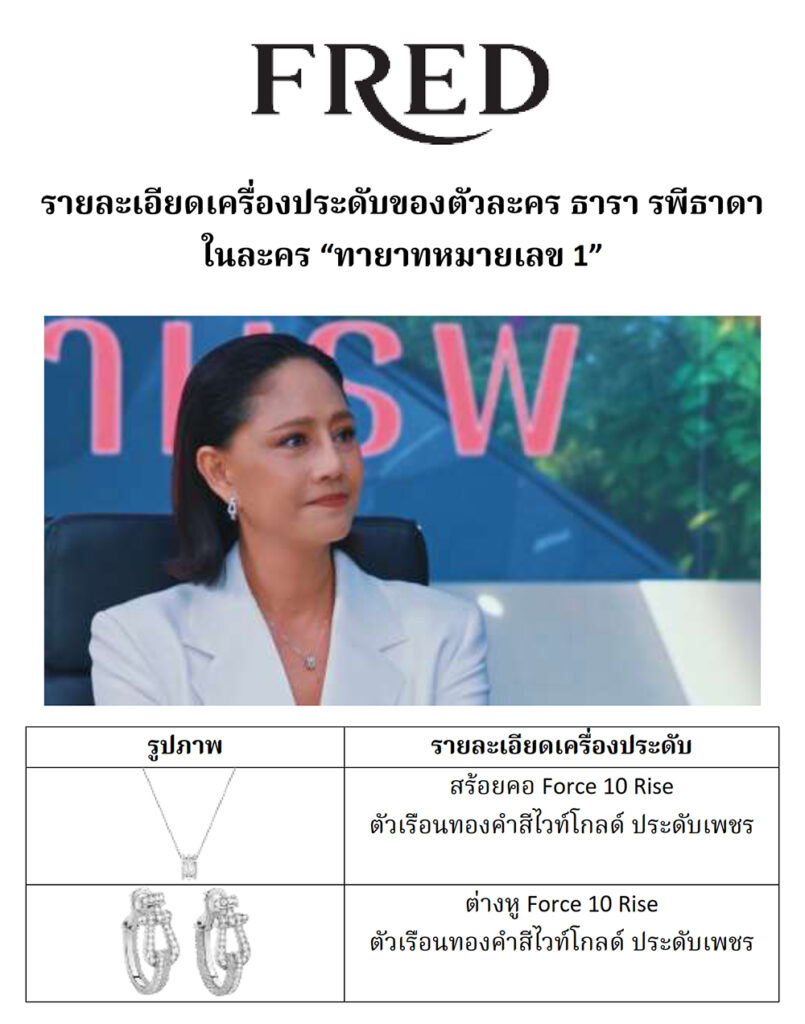 เมซง FRED แบรนด์จิวเวลรี่สัญชาติฝรั่งเศส ปรากฏในละคร “ทายาทหมายเลข 1” โดยในตอนที่ 20 ตัวละคร ธารา (รับบทโดย นก สินจัย) ได้สวมใส่สร้อยคอและต่างหู Force 10 Rise จากคอลเล็กชั่นไอคอนิก Force 10 ที่โดดเด่นด้วยองค์ประกอบการออกแบบด้วยสัญลักษณ์ของความทรงพลังและแน่วแน่อย่างสายเคเบิลและบักเคิล พร้อมเติมความสมบูรณ์ด้วยเส้นสายประดับเพชร สร้อยคอและต่างหู Force 10 Rise นี้ไม่ได้เป็นเพียงเครื่องประดับ แต่ยังเป็นสัญลักษณ์ของความแกร่งกล้าที่สะท้อนคาแรกเตอร์อันกล้าหาญของตัวละครธารา ผู้นำหญิงแห่งตระกูลรพีธาดาและผู้บริหารหญิงของบริษัทสยามรพีกรุ๊ป ที่แข็งแกร่งและพร้อมรับมือทุกสถานการณ์และอุปสรรคด้วยความมั่นใจได้อย่างสมบูรณ์แบบ.