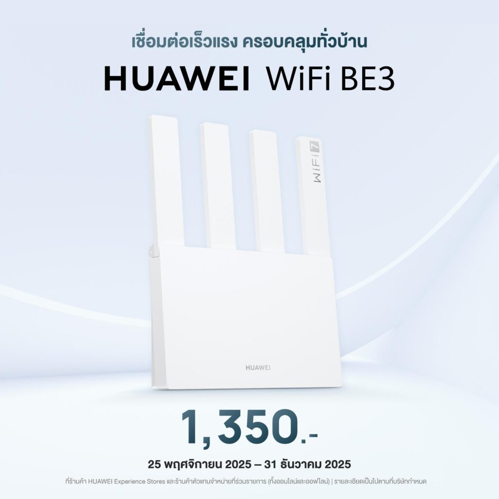 หัวเว่ย คอนซูมเมอร์ บิสสิเนส กรุ๊ป (ประเทศไทย) เปิดตัวเราเตอร์สองรุ่นใหม่ล่าสุด HUAWEI WiFi Mesh X1 Pro และ HUAWEI WiFi BE3 ที่มอบประสิทธิภาพเต็มพิกัดด้วยมาตรฐาน Wi-Fi 7 ให้ความเร็วสูงสุดได้ถึง 3.6Gbps พร้อมเป็นหัวใจของไลฟ์สไตล์ดิจิทัลในทุกบ้าน การันตีทั้งความแรงสัญญาณ ความปลอดภัย การตั้งค่าที่สะดวกสบาย และดีไซน์สวยเฉี่ยวที่เข้ากับทุกห้องได้อย่างลงตัว เตรียมวางจำหน่ายวันที่ 25 พฤศจิกายน 2568 ในราคาเริ่มต้นเพียง 1,350 บาท!