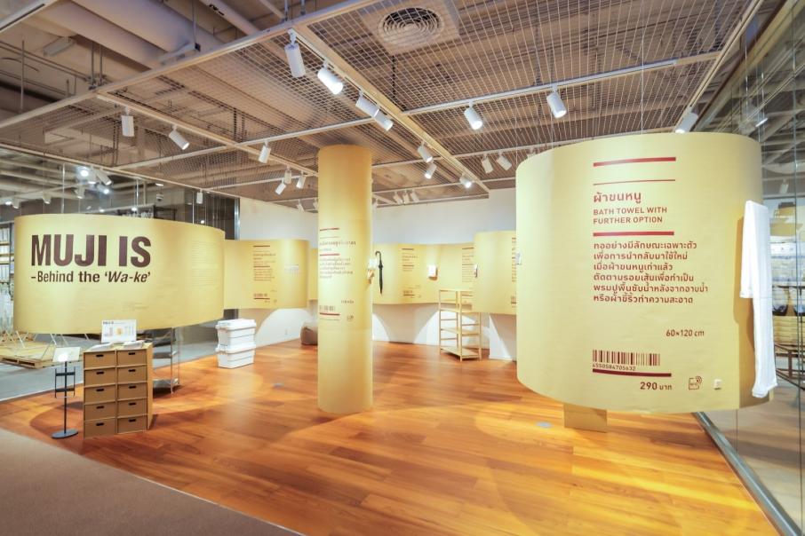 นับเป็นครั้งแรกที่ดีไซน์ของร้านสะท้อนเอกลักษณ์ความเป็นไทยอย่างเต็มรูปแบบ ผสานความเรียบง่าย เชื่อมโยงความเป็นธรรมชาติ (Natural) การมีชีวิตที่ดี (Well-being) และประสบการณ์ (Experience) ผ่านการใช้วัสดุรีไซเคิลที่เป็นมิตรต่อสิ่งแวดล้อม นำกลับมาใช้ใหม่ในทุกรายละเอียด สามารถพบเห็นได้ในโซนต่างๆภายในร้าน สะท้อนมาตรฐานระดับโลกของ MUJI ที่นำเสนอความเรียบง่าย มีเอกลักษณ์ และคงคุณภาพแบบญี่ปุ่นอย่างแท้จริง