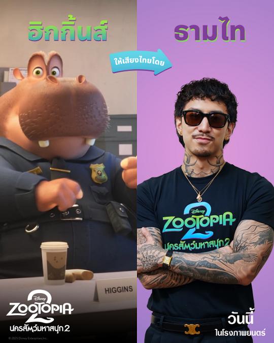 ธามไท ให้เสียงไทยเป็น “ฮิกกิ้นส์” (Higgins) ฮิปโปโปเตมัสตัวผู้ คู่หูของ Bloats หนึ่งในสมาชิกของกรมตำรวจซูโทเปีย