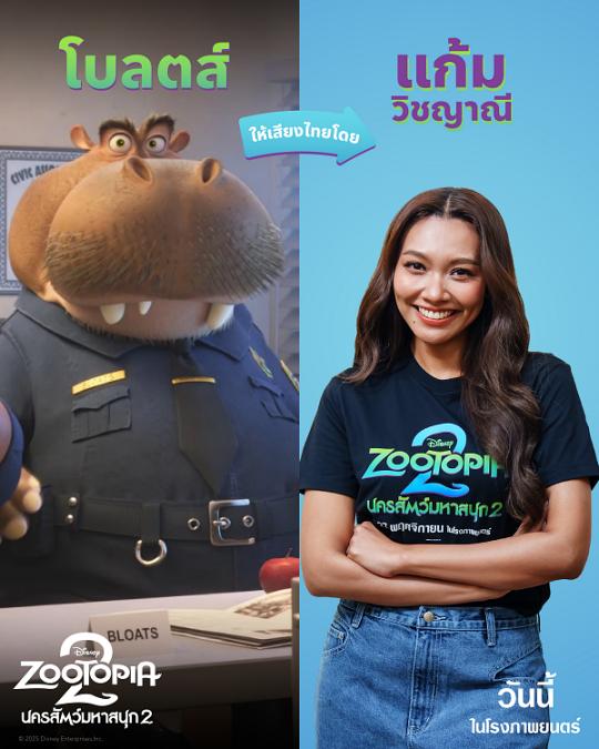 ก้ม วิชญาณี ให้เสียงไทยเป็น “โบลตส์” (Bloats) ฮิปโปโปเตมัสที่ทำงานในกรมตำรวจซูโทเปีย คู่กับเจ้าหน้าที่ Higgins และมีหน้าที่ไล่จับผู้ร้ายใหม่อย่าง Judy และ Nick