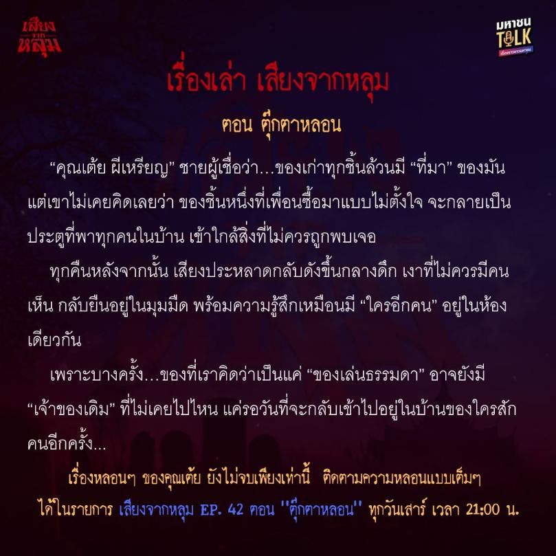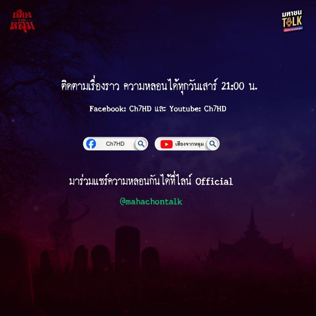 ส่วนใครที่มีเรื่องราวสยองขวัญที่อยากมาแชร์ สามารถแอดไลน์มาเล่าได้ที่ @mahachontalk พบกับรายการพอดแคสต์ “เสียงจากหลุม” โปรเจ็กต์ มหาชนTalk อัปเดตอีพีใหม่ ทุกวันเสาร์ เวลา 21.00 น. ทาง YouTube, Facebook : Ch7HD <https://www.facebook.com/Ch7HD/> และเว็บไซต์BUGABOO.TV