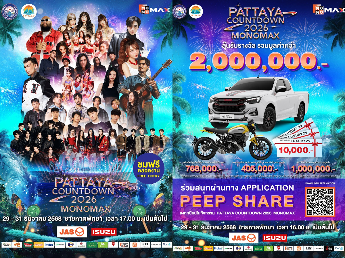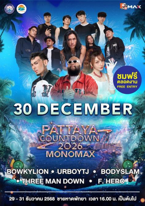 เพิ่มดีกรีความอลังการในการจัดงานเฉลิมฉลองส่งท้ายปีเก่าต้อนรับปีใหม่ สุดยิ่งใหญ่แห่งปี สำหรับเทศกาลแห่งความสุข โดย เมืองพัทยา และ องค์การบริหารส่วนจังหวัดชลบุรี ร่วมกับ MONOMAX จัดงาน “PATTAYA COUNTDOWN 2026 MONOMAX” (พัทยา เคานต์ดาวน์ 2026 โมโนแมกซ์) โดย ผู้จัดงานพร้อมเนรมิตพื้นที่ชายหาดเมืองพัทยา เพื่อเป็นการส่งเสริมและเผยแพร่การท่องเที่ยวเมืองพัทยา พร้อมยกระดับคุณภาพการท่องเที่ยวในพื้นที่สู่การท่องเที่ยวระดับโลก ภายในงานเต็มอิ่มกับกิจกรรมต่าง ๆ ตลอด 3 วัน 3 คืน ในวันที่ 29-31 ธันวาคม 2568 ตั้งแต่เวลา 16.00 น. เป็นต้นไป ณ บริเวณชายหาดพัทยา จังหวัดชลบุรี พร้อมโชว์ แสง สี เสียง จัดเต็มอย่างยิ่งใหญ่ ชมฟรีตลอดงาน!